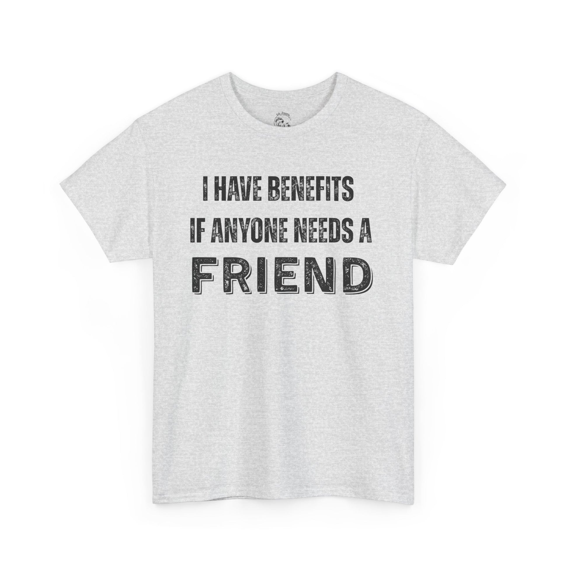 Introducing our Unisex Heavy Cotton Tee, perfect for those who love to express themselves with humor and style. This shirt features a playful design that reads, "I HAVE BENEFITS IF ANYONE NEEDS A FRIEND," making it an ideal addition to your casual wardrobe. Made from soft, durable cotton, it offers a relaxed fit that allows for comfortable all-day wear. The classic crew neckline and lightweight fabric are perfect for layering or wearing on their own. Whether you're heading to a casual outing, a get-together with friends, or just lounging at home, this tee is versatile enough to fit any occasion. It's a great gift for friends and family for birthdays, holidays, or just because! With its humorous message, it's sure to spark conversations and bring smiles. Celebrate your friendships in style!