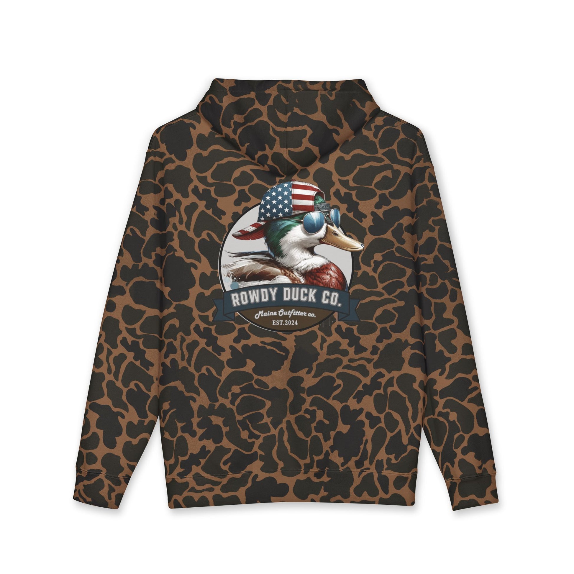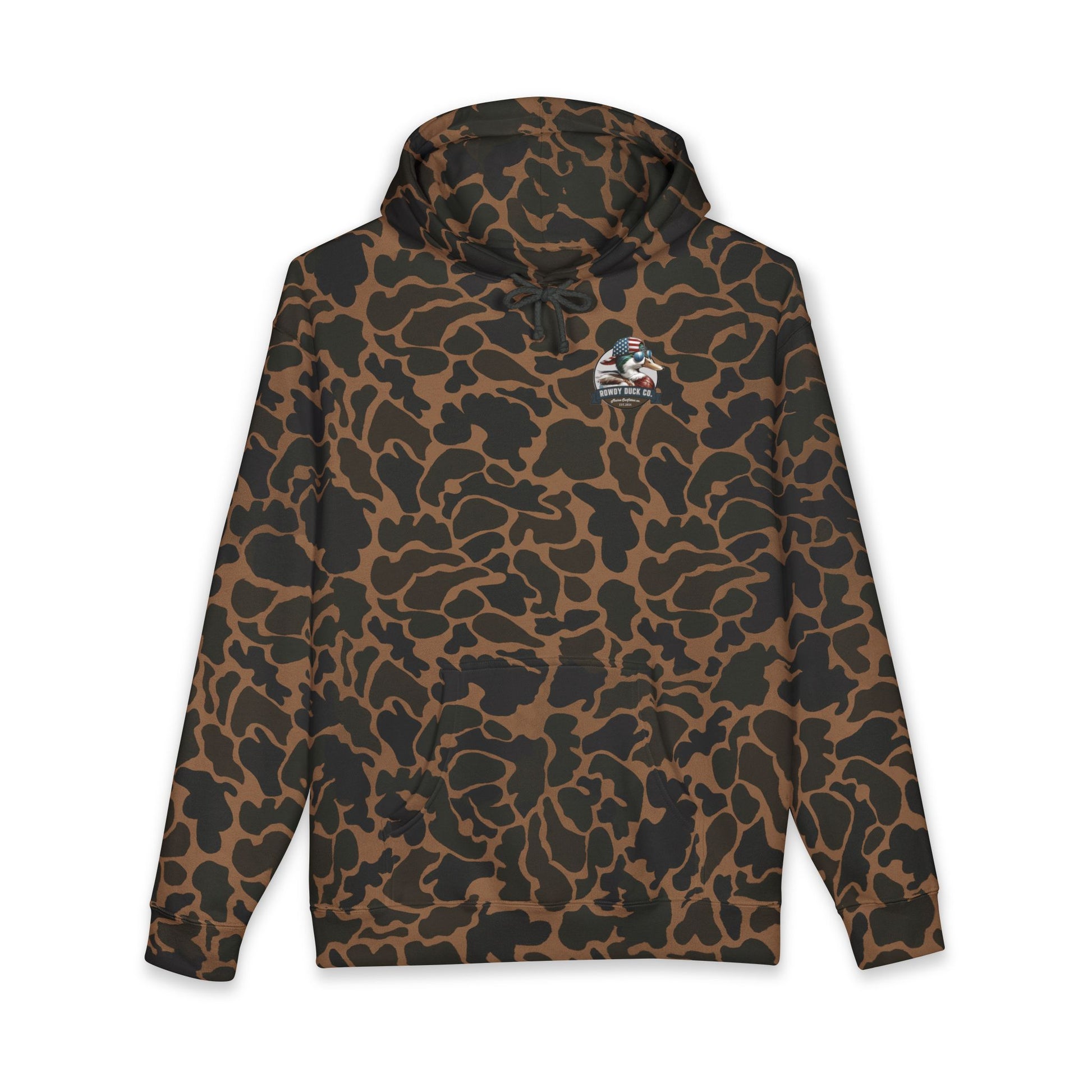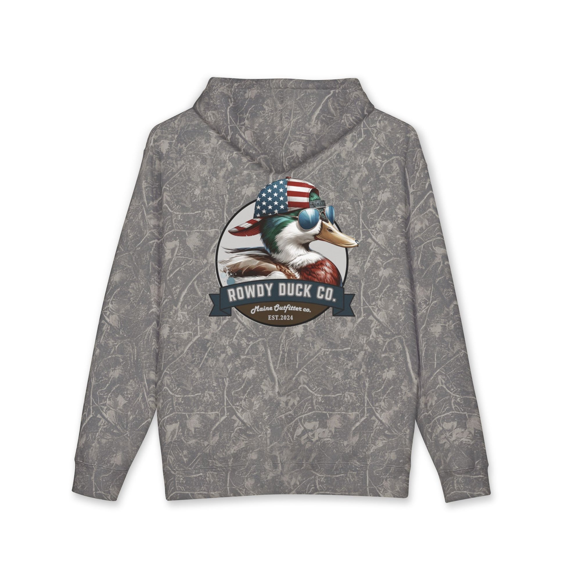This heavyweight hooded sweatshirt brings rugged warmth and personality to mornings on the water and weekends at the cabin. Built from a substantial cotton-poly blend with a soft fleece-lined hood, it feels like a worn-in favorite from the first wear. The camo-patterned fabric provides subtle, outdoorsy texture while the bold Rowdy Duck graphic with an American-flag bandana adds a playful, spirited touch. Generous cut and ribbed cuffs hold heat where you want it; the tear-away label keeps things comfortable under the hood. Wear it layered over a flannel before the hunt, during bonfire nights, or while tinkering in the garage—this hoodie moves with you and keeps the cold out without sacrificing character.
