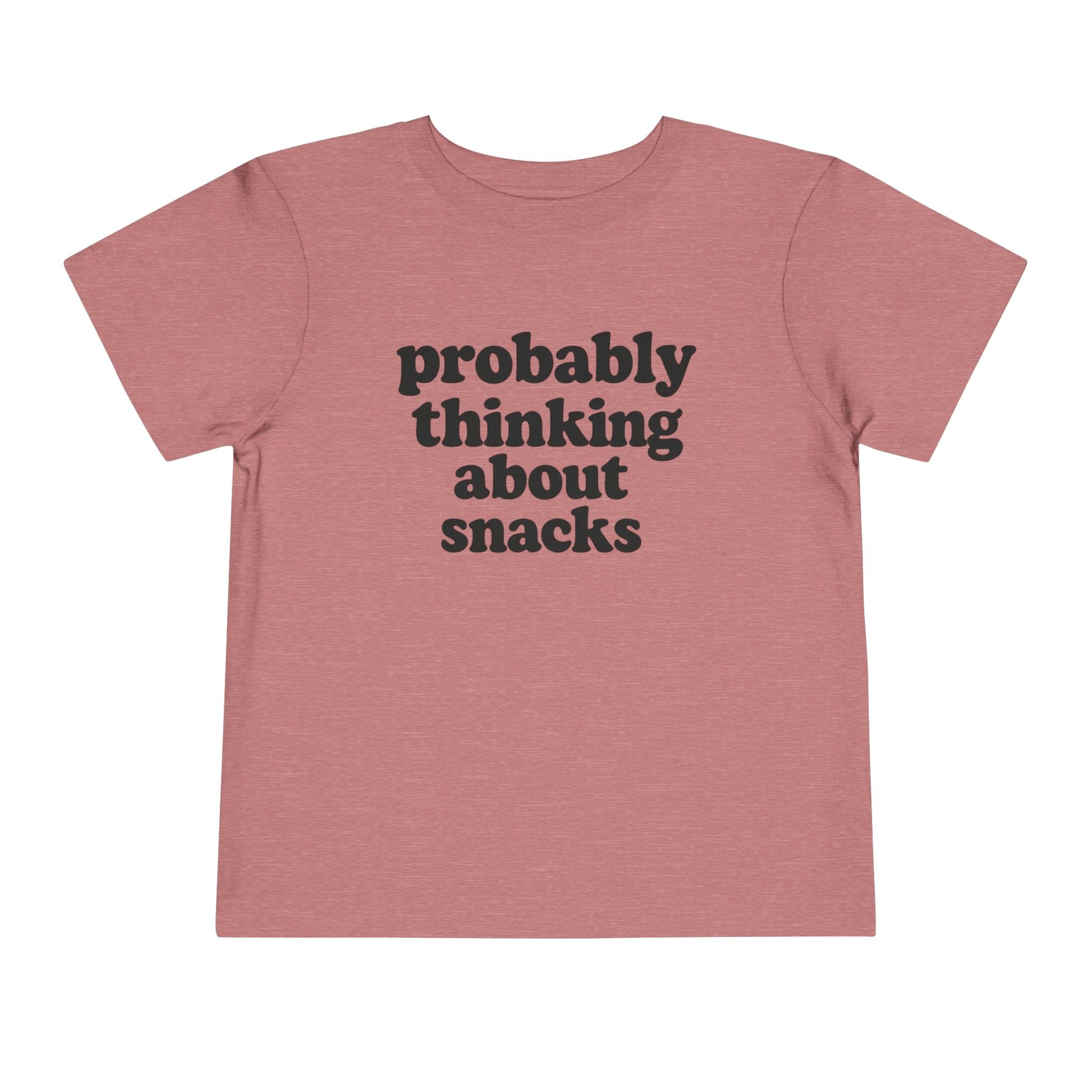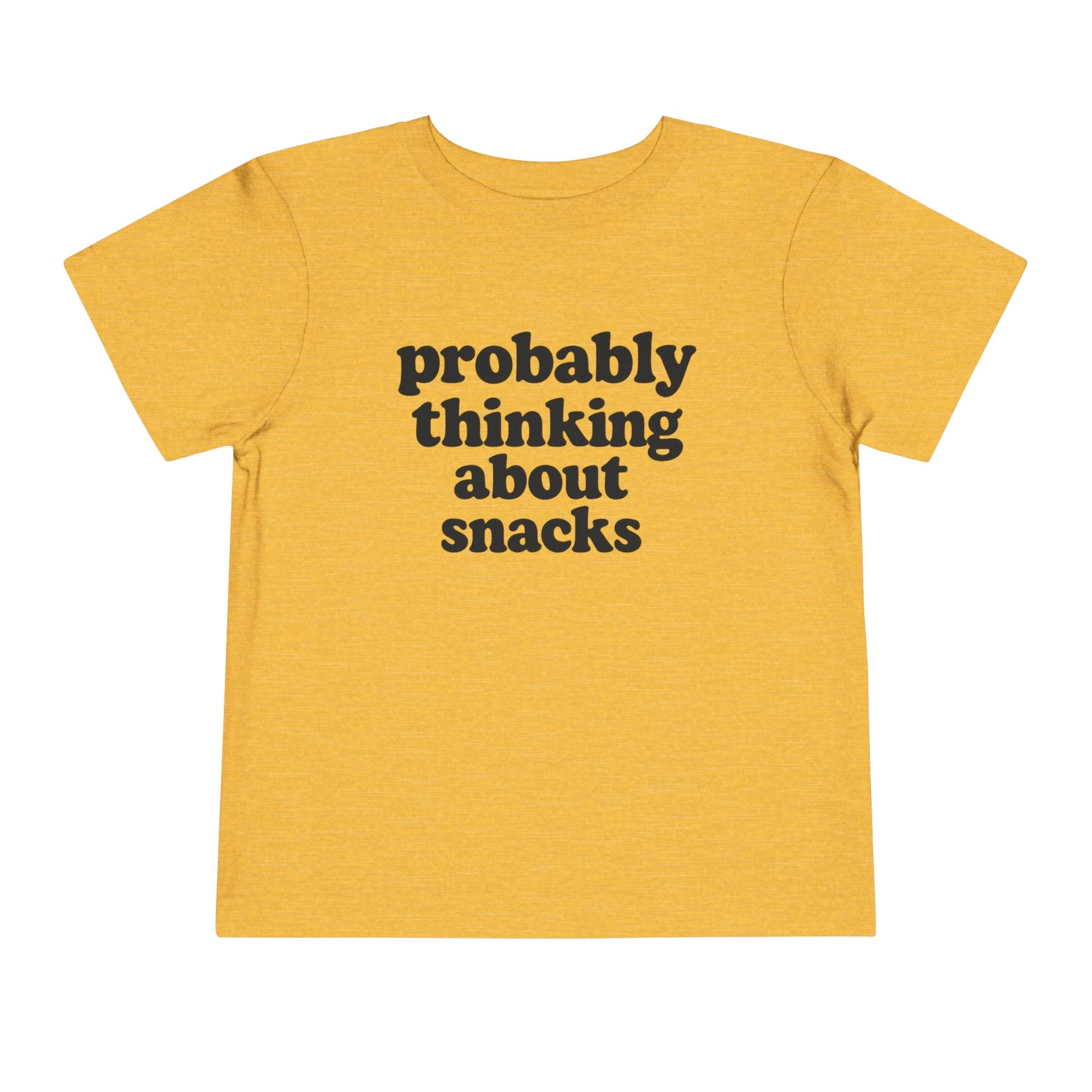 Soft, lightweight toddler tee with a cheeky printed message that reads “probably thinking about snacks.” The cotton-forward fabric feels gentle against little skin and holds up to everyday play. Short sleeves and side seams give the shirt a tidy fit that layers easily under jackets or pairs with shorts for playground days. The minimalist black text on a clean white canvas keeps the look simple and playful — made to make caregivers smile whenever snack time is a possibility.